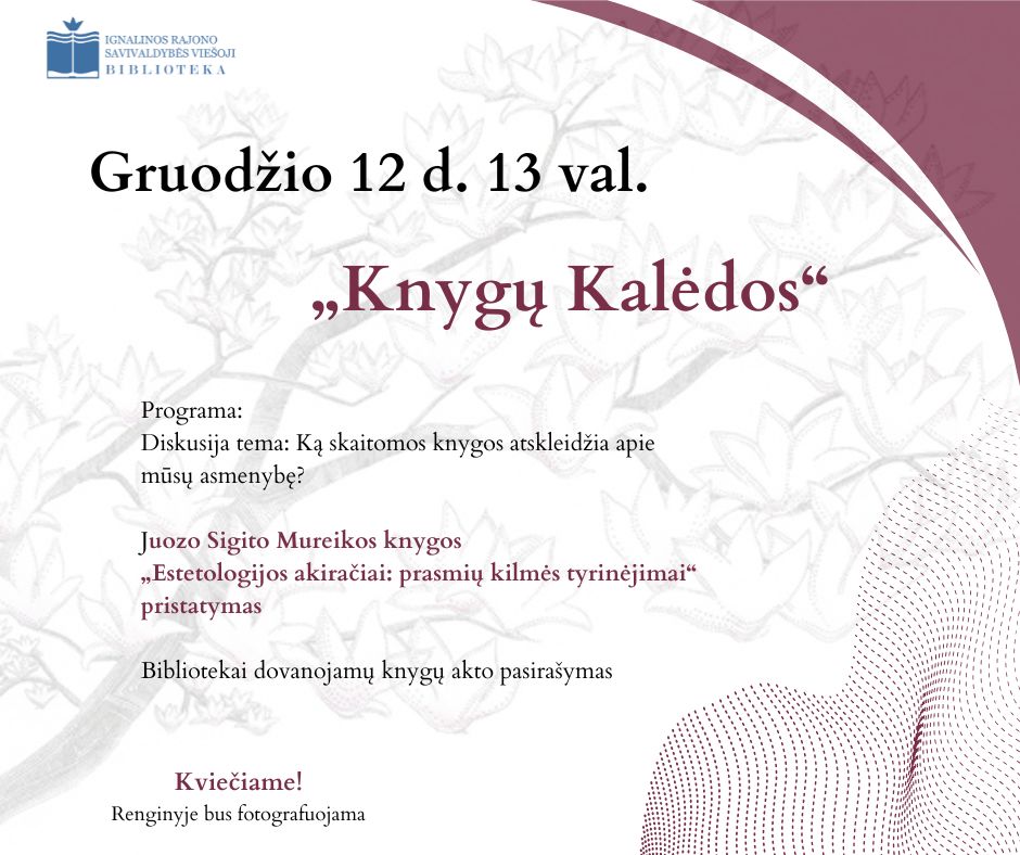 Gruodžio 12 d. 13 val. Ignalinos bibliotekoje vyks „Knygų Kalėdos“. Programoje – diskusija „Ką skaitomos knygos atskleidžia apie mūsų asmenybę?“, prof. Juozo Sigito Mureikos knygos Estetologijos akiračiai: prasmių kilmės tyrinėjimai pristatymas ir bibliotekai dovanojamų knygų akto pasirašymas. Renginyje dalyvauja knygos autorius, poetė Ona Suncovienė, bibliotekų bičiulis dim. plk. Arūnas Dudavičius ir bibliotekininkė Marytė Burneikienė.