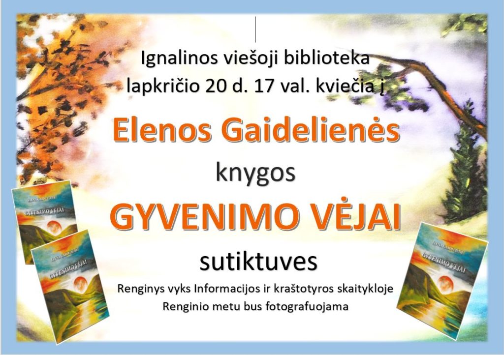 Lapkričio 20 d. 17 val. Informacijos ir kraštotyros skaitykloje Elenos Gaidelienės knygos „Gyvenimo vėjai“ SUTIKTUVĖS.