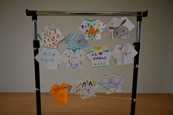 Po knygos aptarimo vaikų laukė kūrybinė užduotis – dekoruoti iš popieriaus pagamintus marškinėlius. ![]()