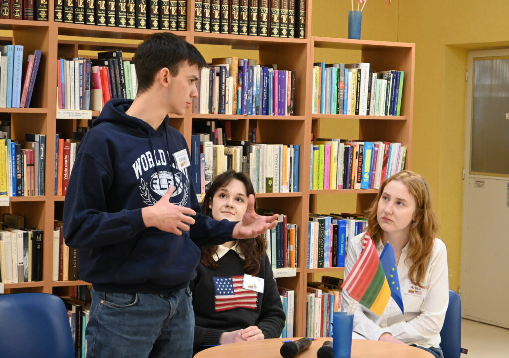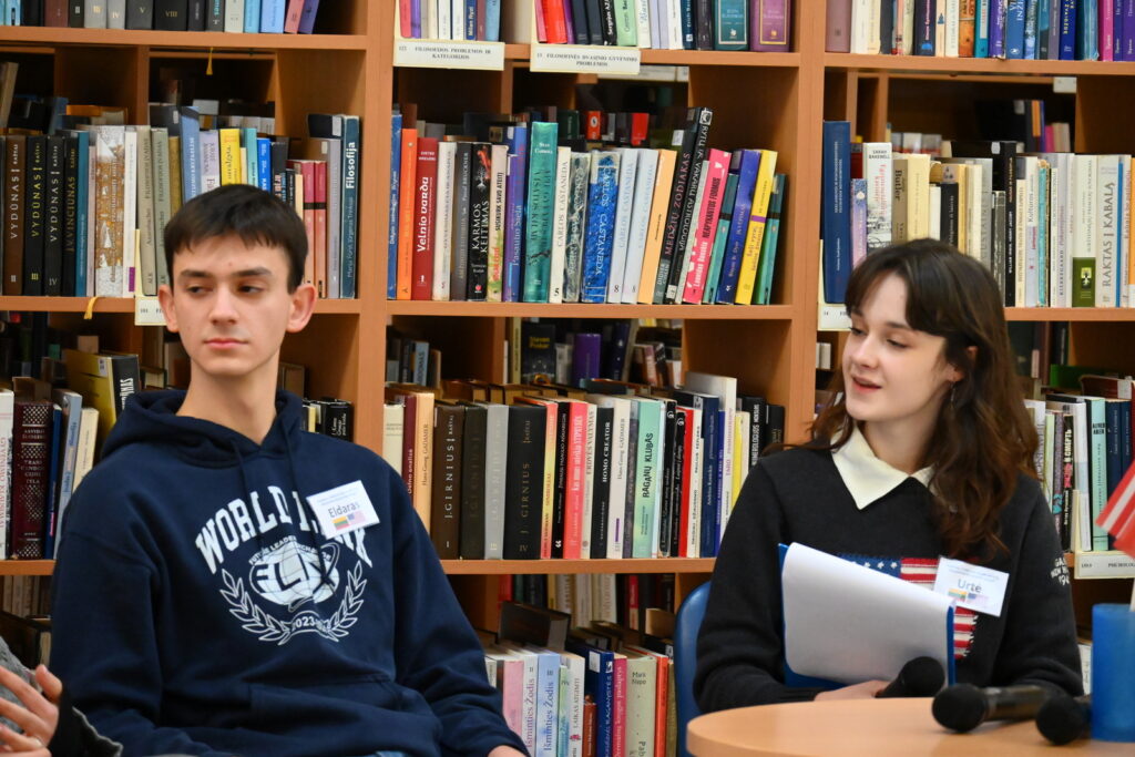 Diskusijos metu buvo aptartos JAV šventės – tiek tos, kurios švenčiamos ir Lietuvoje, tiek visiškai negirdėtos, bet nustebinusios savo unikalumu. Moksleiviai sužinojo apie amerikietiškas tradicijas, kultūrines vertybes, šeimos svarbą ir net „amerikietiškos svajonės“ fenomeną. Eldaras ir Katrin taip pat rekomendavo knygas bei filmus, kurie atspindi JAV kultūrą ir padeda geriau suprasti šią šalį.