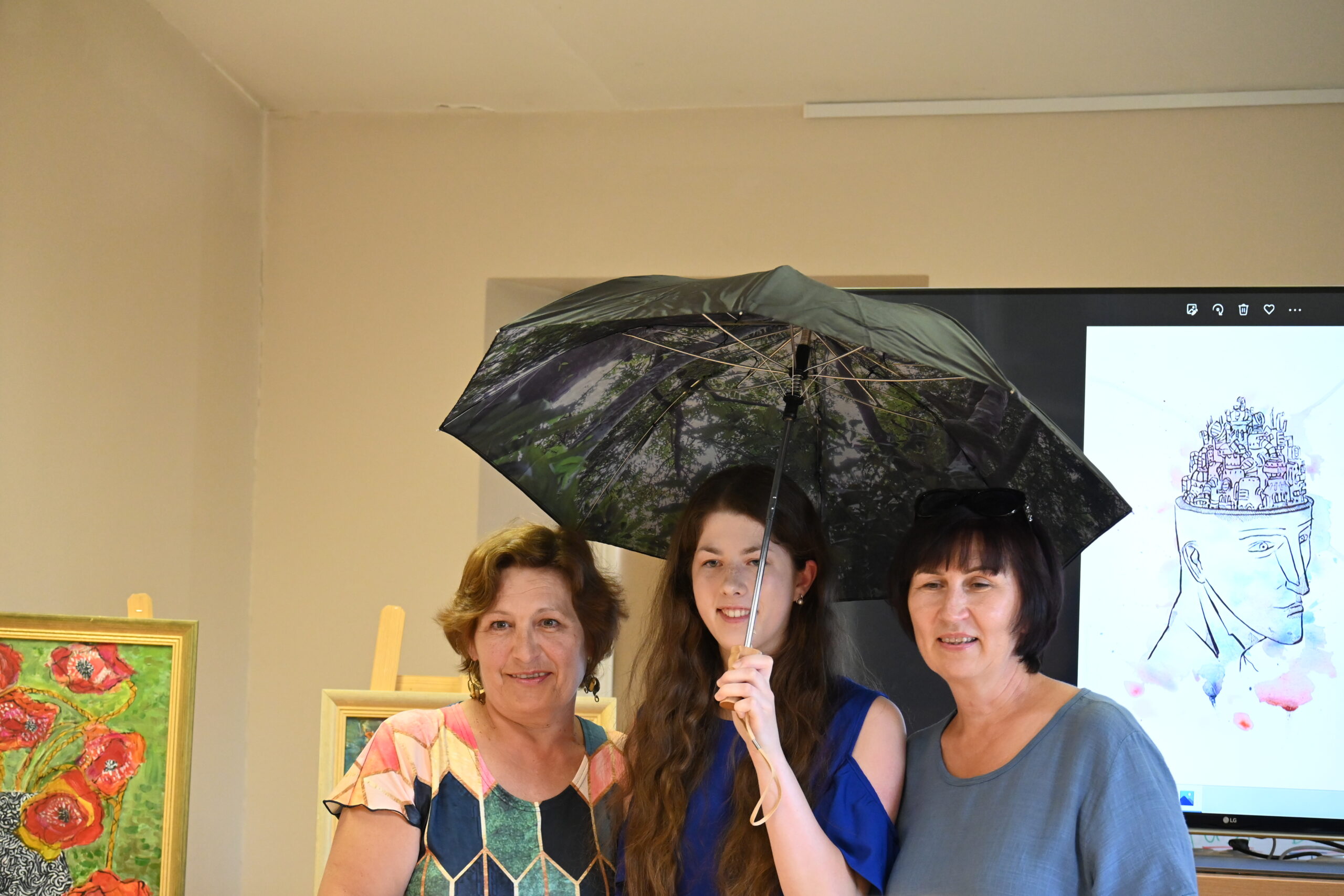 Jaukiame pokalbyje dalyvavo ir menininkės šeima, giminaičiai, esami ir gal būsimi draugai bei kūrėjos gerbėjai. Visi rado, kuo pasidžiaugti, ko palinkėti ir… ką padovanoti: plaukė gėlių jūra. Pabaigos akcentas – daug daug apsikabinimų ir nuo šiol ne tik nuo lietaus saugosiantis, bet ir jaukius gimtuosius miškus priminsiantis stilizuotas skėtis – bibliotekos dovana.