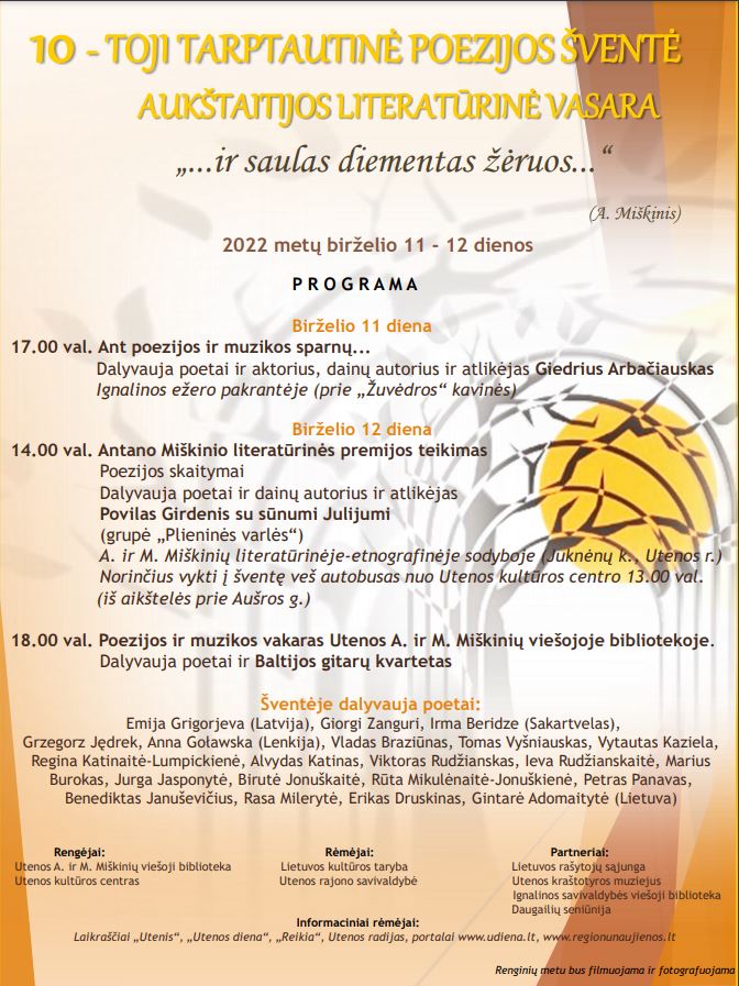 Birželio 11 d. kviečiame į 10-osios tarptautinės poezijos šventės „…ir saulas diementas žėruos“ renginį „Ant poezijos sparnų“, kuris vyks Paplovinio ežero pakrantėje. Dalyvaus poetai ir dainų autorius bei atlikėjas Giedrius Arbačiauskas.