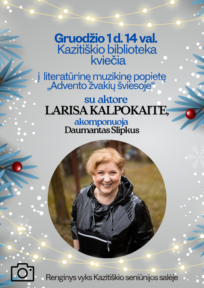 Gruodžio 1 d. 14.00 val. Kazitiškio biblioteka kviečia į literatūrinę muzikinę advento popietę su aktore Larisa Kalpokaite. Akompanuoja pianistas Daumantas Slipkus.