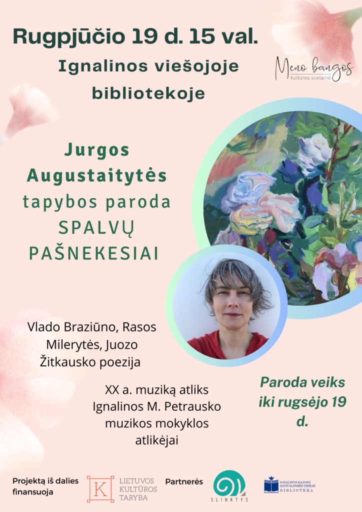 Rugpjūčio 19 d. 15 00 val. tapytojos Jurgos Augustaitytės parodos atidarymas. Dalyvauja dailininkė, poetai Vladas Braziūnas ir Rasa Milerytė, Ignalinos Miko Petrausko muzikos mokyklos jaunieji muzikantai. Paroda veiks iki rugsėjo 19 d.