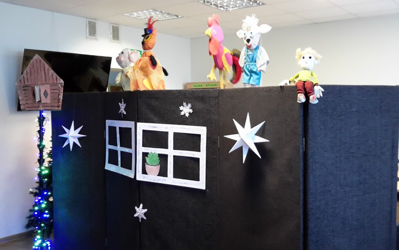 Gruodžio 14-ąjč Dūkšto bibliotekoje pasklido  Kalėdų laukimo nuotaika. Ignalinos viešosios bibliotekos lėlių teatras „Mįsliukas“ mažiesiems dūkštiečiams parodė nuotaikingą ir pamokančią pasaką „Katės namai“.  Ikimokyklinio ugdymo grupės vaikai  smalsiai ir susikaupę sekė pasakėlės veiksmą, iš kurio suprato kokie reikalingi būna draugai ir kaip  svarbu padėti patekusiam į bėdą. Pasakos personažus įgarsino Sandra Rastenytė, Rūta Juršienė ir Erika Puzirauskaitė,   Po spektaklio vaikus Sandra  įtraukė į smagius žaidimus.