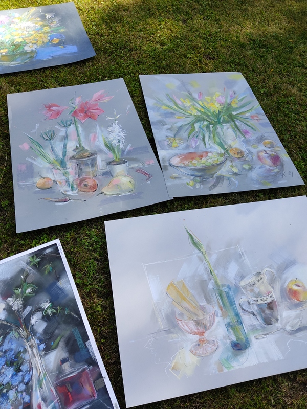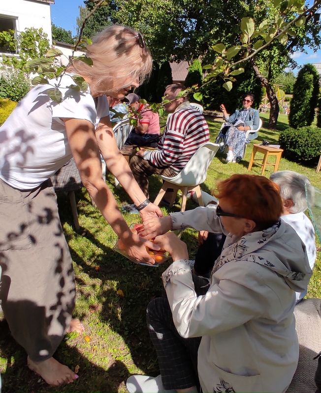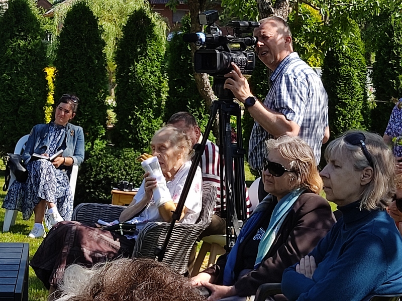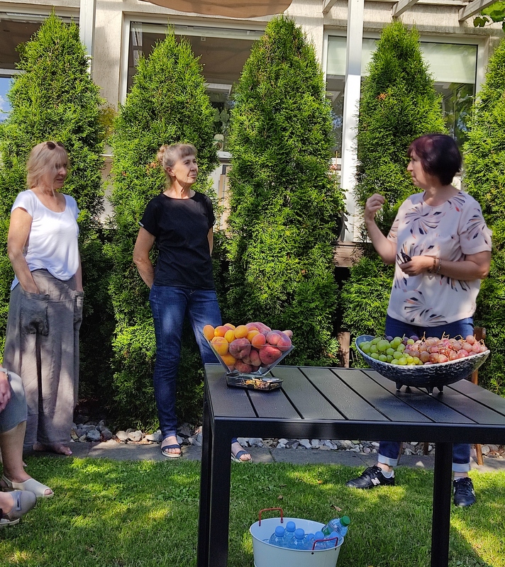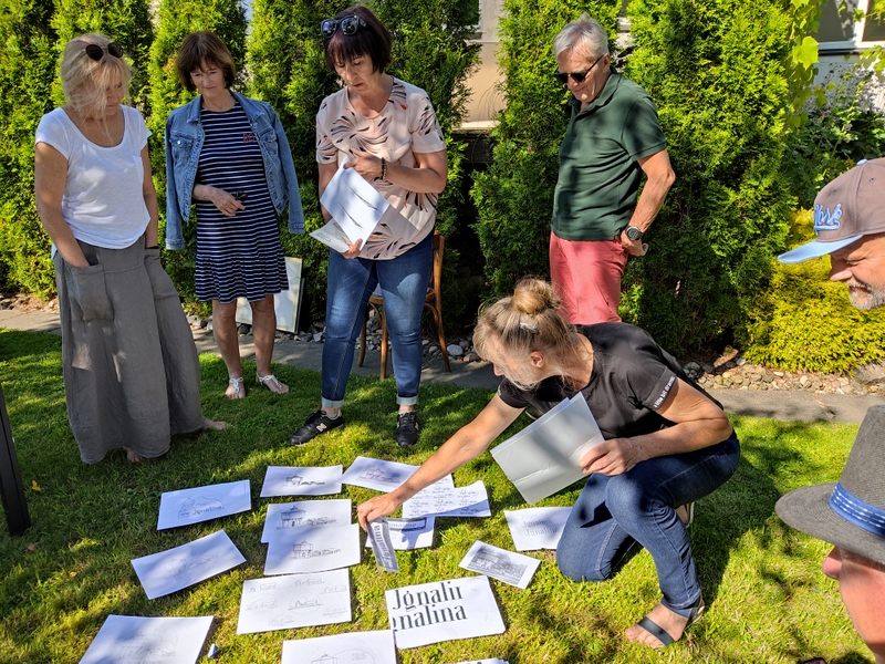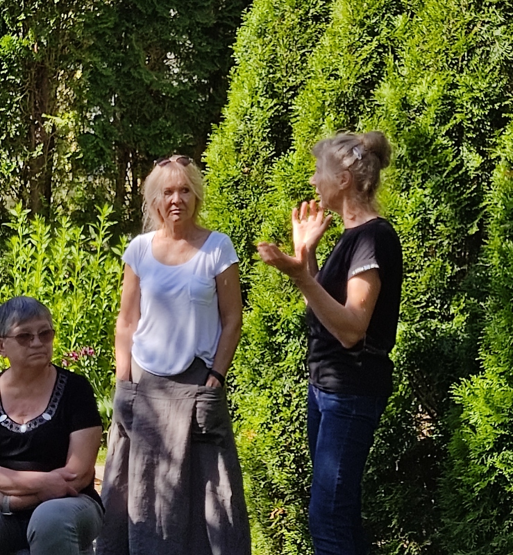 Susitikimo pabaigoje Jolantai ir Volandai dovanoti bibliotekos skėčiai, dėkota už šiltą priėmimą, bendravimą, pasidalijimą savo mintimis, jausmais, prisiminimais… Niekas neskubėjo skirstytis, dar vis vaikštinėjo, apžiūrinėjo gėlynus, kai kam pavyko žvilgtelėti ir į jaukias dirbtuves, meno muziejų primenančias poilsio erdves. Na, o projektas „Pokalbiai su dailininkais“ bus tęsiamas. Kitas susitikimas – su dar studijuojančia jaunąja menininke Ievute.