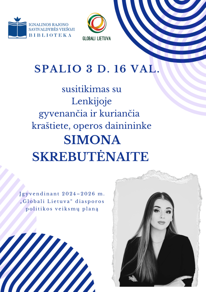 Spalio 3 d. Ignalinos viešoji biblioteka kviečia į susitikimą su Lenkijoje gyvenančia ir kuriančia kraštiete, operos dainininke Simona Skrebutėnaite.