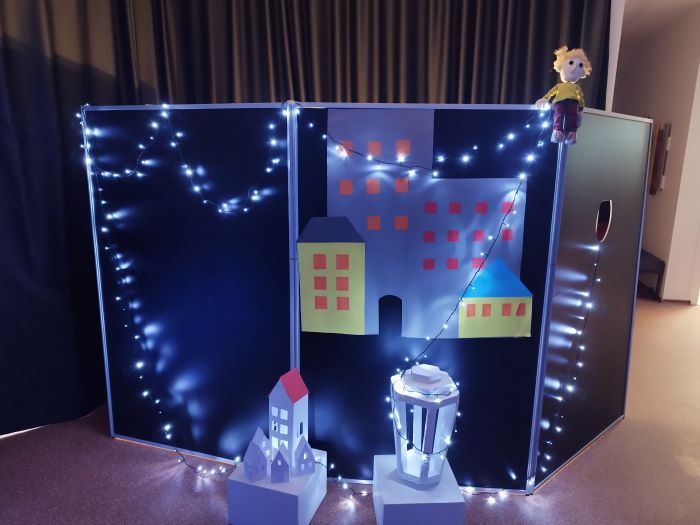 Bibliotekos lėlių teatras „Mįsliukas“ mažiesiems pristatė šventinį spektaklį pagal David Litchfield ir Teresos Heapy knygą „Spindintis miestas“. Tai jautri istorija apie draugystę, kurioje pasakojama apie peliuko ir meškiuko kelionę, patirtus pavojus, nuotykius, ir apie tai kaip svarbu turėti tikrą draugą.