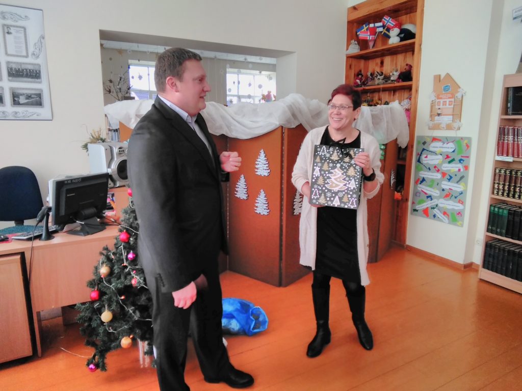 Iš anksto pranešęs, kad Ceikinių kaimo bendruomenės vaikučius aplankys gruodžio 18 d., į biblioteką atvyko Kalėdų Senelis. Ir ne tik jis. Mažuosius pradžiugino Ignalinos rajono savivaldybės viešosios bibliotekos lėlių teatriukas „Mįsliukas“.