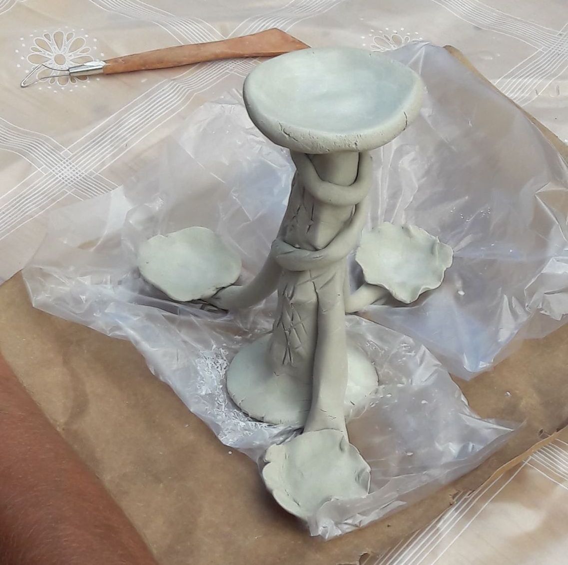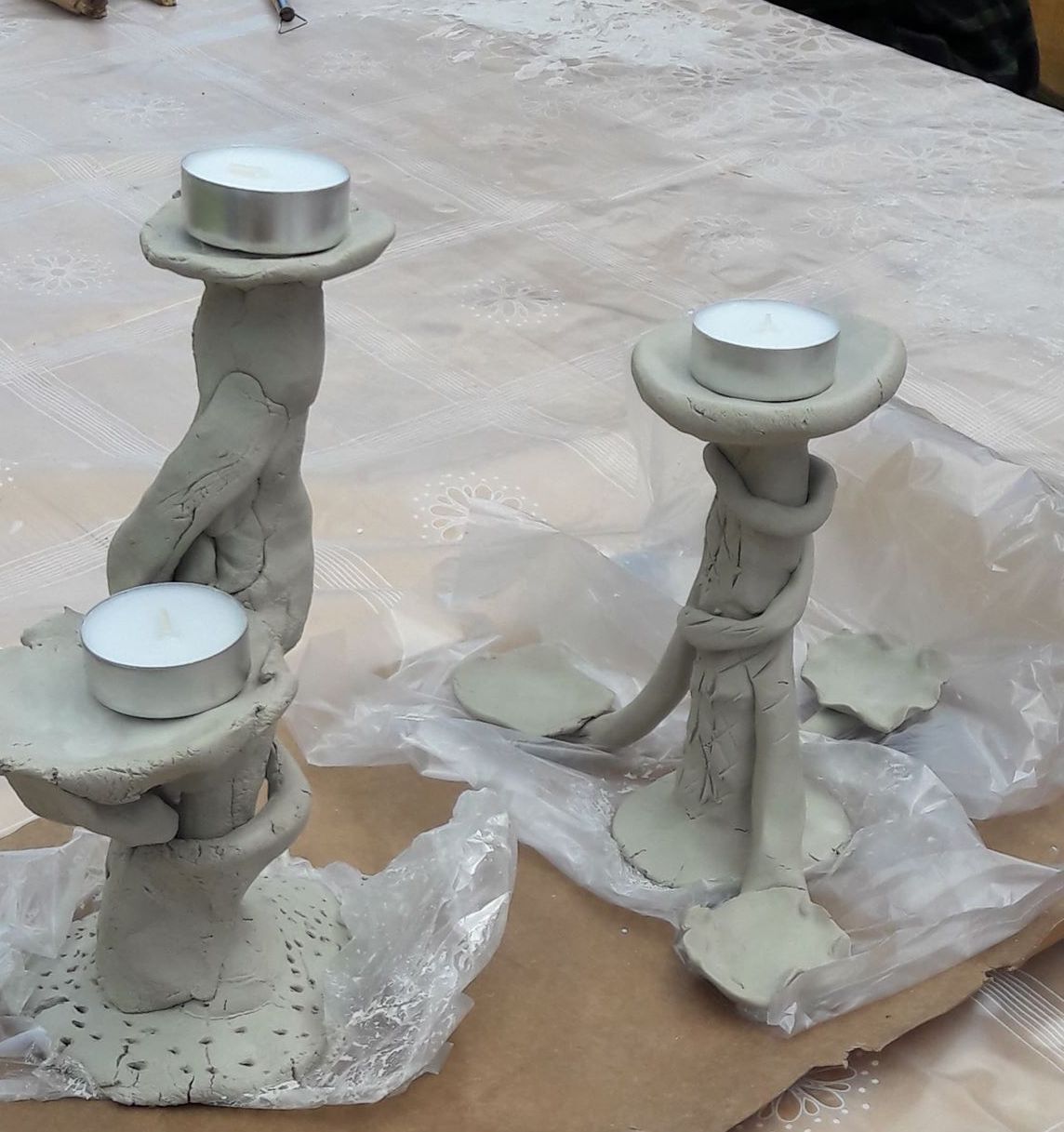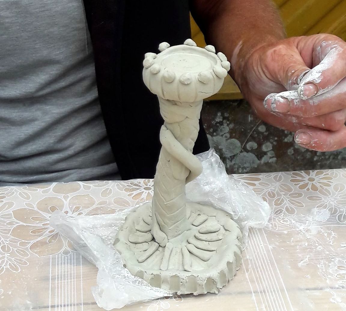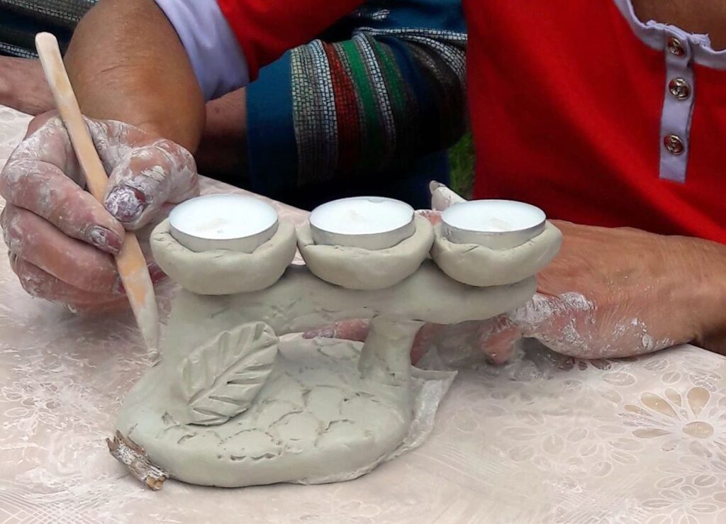 „Kiekvienas prisilietimas prie molio yra kitoks“, – sakė tautodailininkė. – Tai priklauso nuo nuotaikos, nuo molio pajautimo. Reikia pajausti ir atrasti kūrinio centrą ir tada leisti vaizduotei kurti.“ Kai Nerija išdalino medžio šakeles nustebome ir nesupratome kam jos reikalingos. Lipdėme linksmai, vieni į kitus pasidairydami ir pajuokaudami. Edukatorė vis drąsino, kad nebijotumėme eksperimentuoti ir fantazuoti. Ir po valandos darbo šakelės virto meniškomis žvakidėmis.