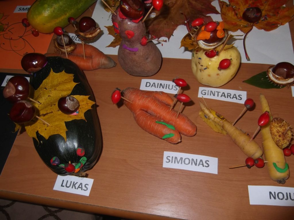 Kiekvienas vaikas yra kūrybingas ir noriai rudens gėrybes panaudoja savo darbeliuose. Kai tik jiems buvo pasiųlyta tema, vaikų rankutėse kiekviena daržovė pavirto netikėtu, nuostabiu darbeliu: viščiuku, avele, ežiuku, pasakos arba mėgstamo filmuko veikėju. Edukacinės valandėlės metu vaikai iš plastilino ir kaštonų, morkų, obuolių, cukinijos ir kitų rudeniškų gėrybių lipdė savo mėgstamą personažą. Vėliau sugalvojo jiems vardus.