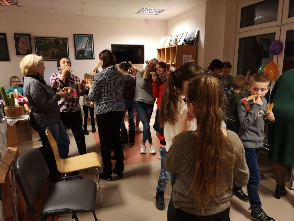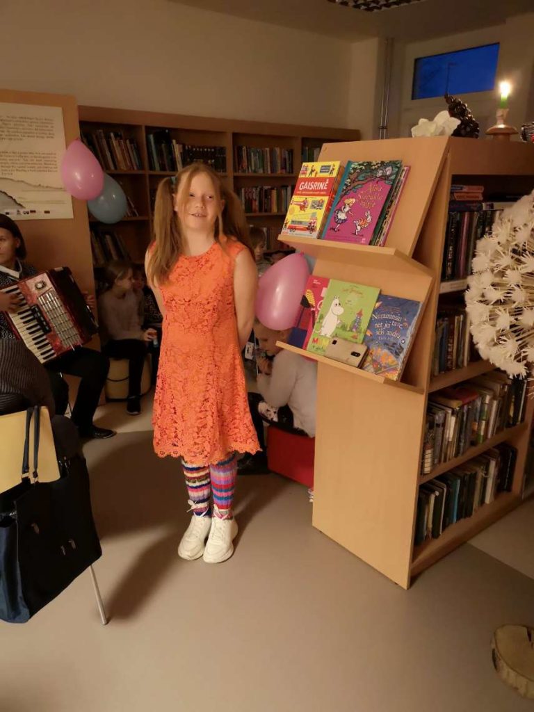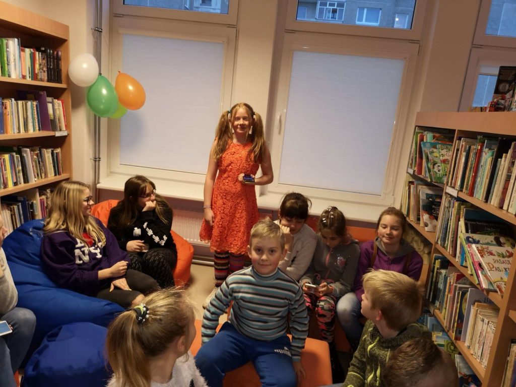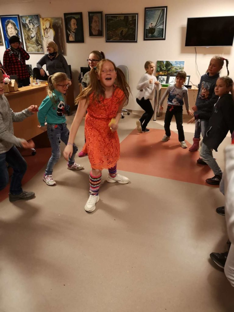 Vėliau buvo švenčiamas tikras Pepės gimtadienis! Koks gi gimtadienis be linksmybių ir saldumynų? Tad buvo tortas su fejerverkais, daniški vafliai, saldainiai, linksmi žaidimai „Dovanų ratas“, „Jurgelis meistrelis“, gimtadienio dainos. Ir, svarbiausia, tarp linksmų vaikų sukosi raudonplaukė mergaitė styrančiomis kasomis ir skirtingomis kojinėmis – tikra Pepė Ilgakojinė. Penktokė Ingrida taip puikiai įkūnijo personažą, kad galima buvo pagalvoti, jog tikroji Pepė stebuklingai atkeliavo į Didžiasalio biblioteką švęsti savo gimtadienio. Šilta, jauki popietė pralėkė labai greitai. Smagu buvo ir skaityti, ir klausyti, kartu visiems dainuoti, jausti savyje šventės virpulį.