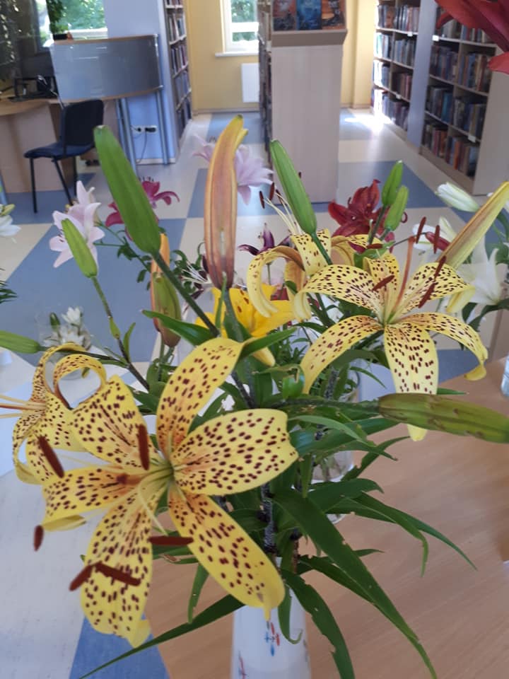 Pernai dėl karantino daugiau dalintasi žiedų nuotraukomis, o šią vasarą, liepos1-15 d., biblioteka džiugino visus skaitytojus ir svečius. Žiedai keitė vienas kitą. Biblioteka dėkoja, visiems prisidėjusiems ir lelijas dovanojusiems.