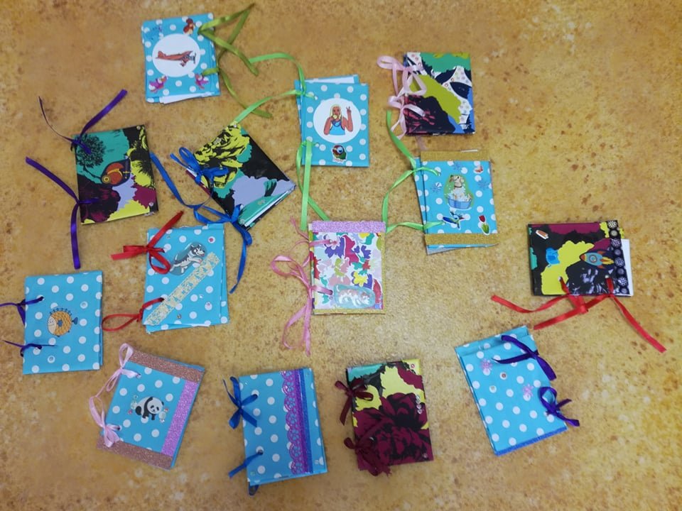 Susirinkusius vaikus Rasa mokino, kaip paprastomis priemonėmis pasigaminti gražią ir originalią užrašų knygutę. Kurdami knygutes vaikai išlaisvino savo kūrybinę fantaziją, todėl nenuostabu, kad visos knygutės išėjo labai skirtingos ir originalios. Džiaugiamės, kad vaikai patyrė daug teigiamų emocijų ir praturtino savo kūrybines galimybes.