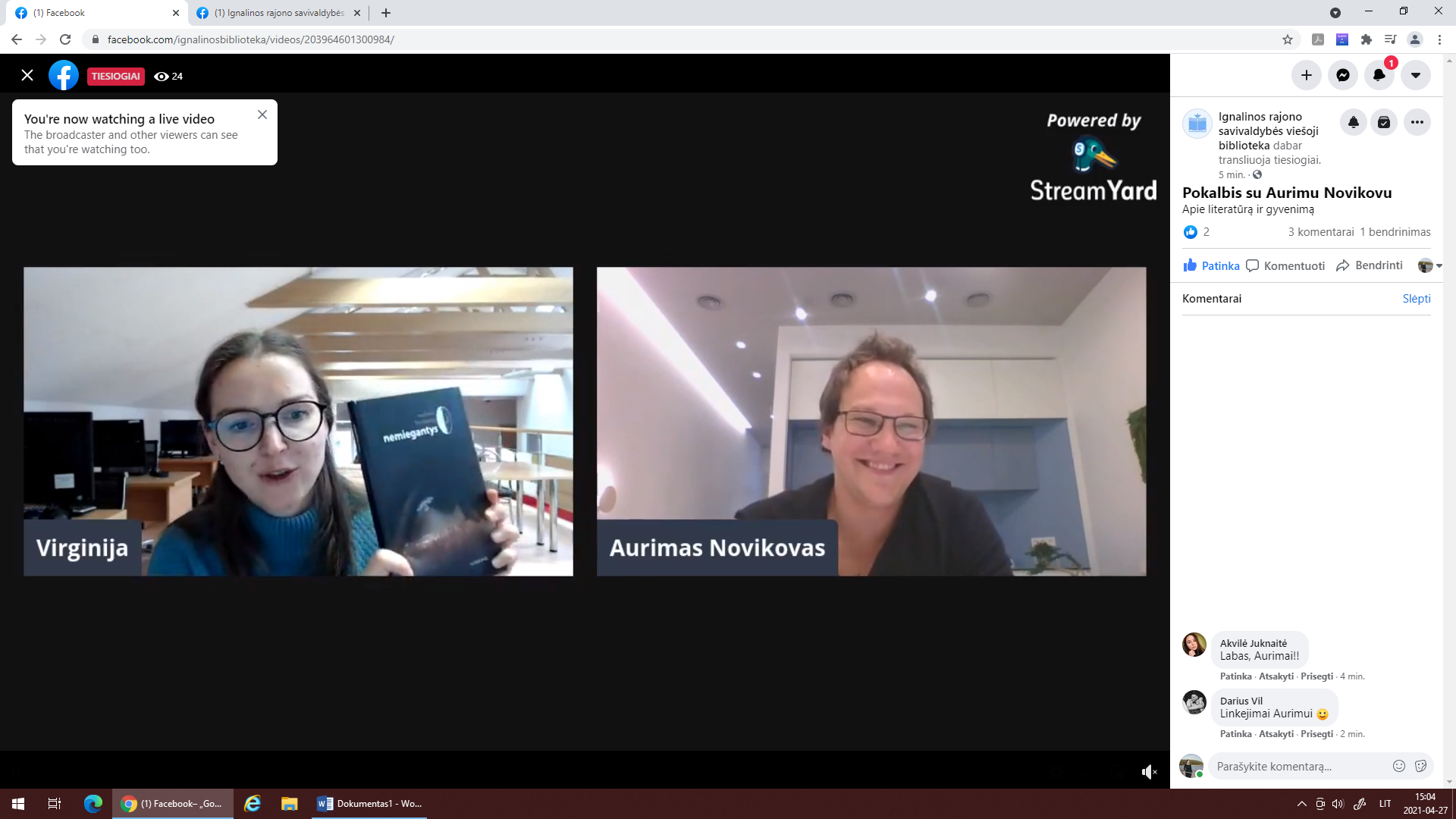 Nacionalinė bibliotekų savaitė, kurios šūkis „Nauja realybė – naujos formos“ jau įsibėgėjo. Balandžio 27 d. vyko tiesioginė transliacija bibliotekos Facebook paskyroje su kraštiečiu, rašytoju Aurimu Novikovu. Kalbėtasi apie literatūrą, planus išleisti knygą ir gyvenimą naujoje realybėje, apie tai, kaip planus pakeitė pasikeitusios aplinkybės. Aurimas klausytojams atskleidė savo rašymo virtuvę, papasakojo apie mėgstamus autorius. Taip pat sudalyvavo bibliotekininkės Virginijos klausimų iššūkyje. Tiesioginės transliacijos įrašą galite pažiūrėti čia: https://www.facebook.com/ignalinosbiblioteka/videos/203964601300984