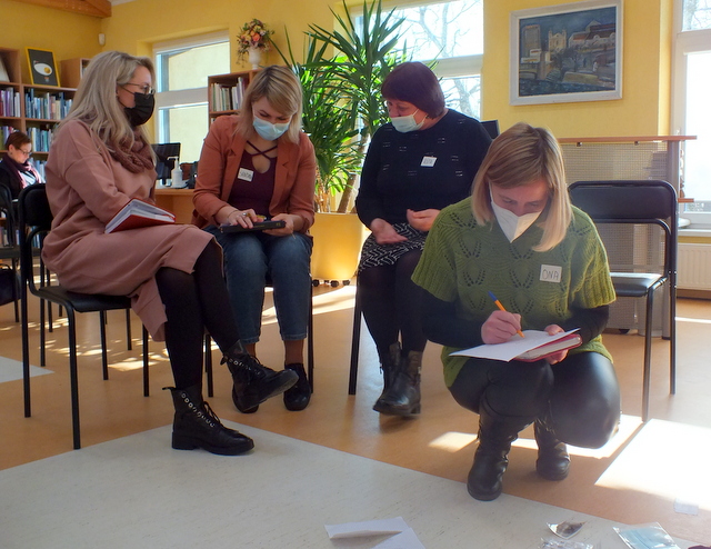 Kiekvienai temai kolegės iš Panevėžio pasiūlė įvairius darbo metodus, ignalinietės juos išbandė, dalyvaudamos pasakojimo pratybose.
