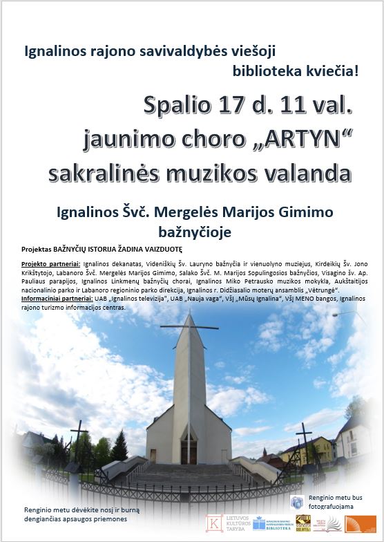 Spalio 17 d. 11 val. Jaunimo choro „ARTyn“ sakralinės muzikos valanda Ignalinos Švč. Mergelės Marijos Gimimo bažnyčioje.