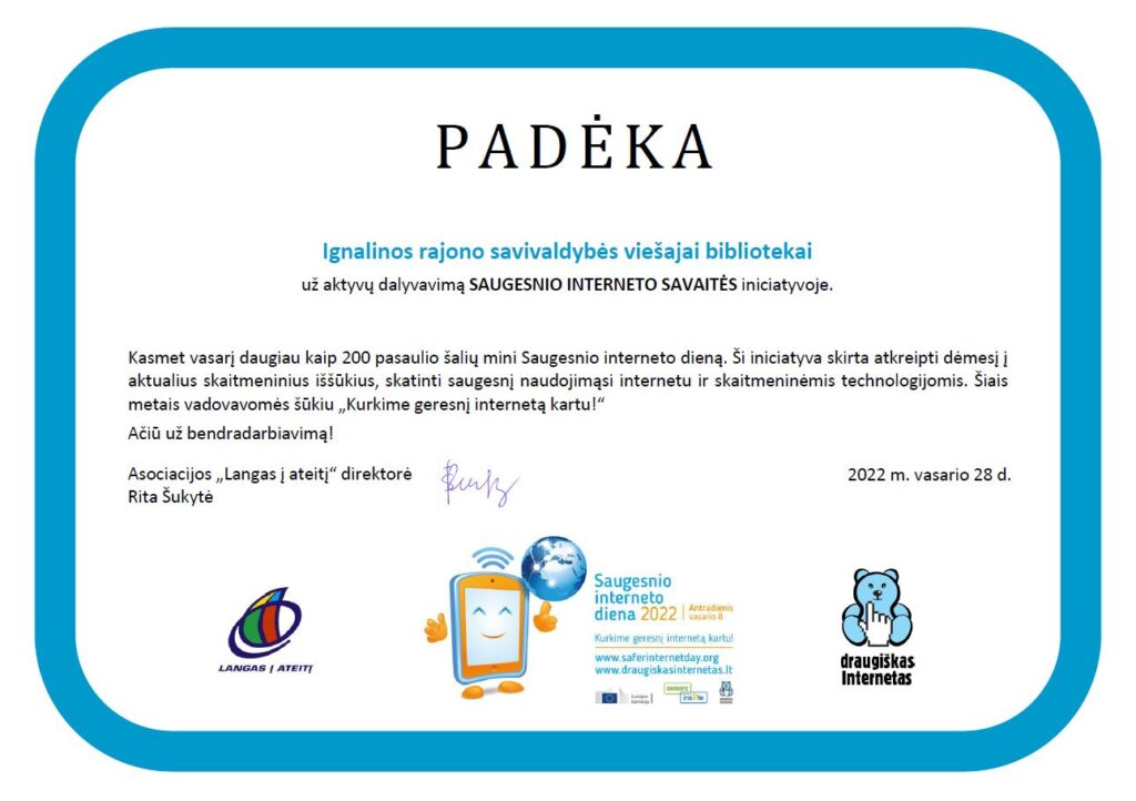 Pradžia » Naujienos » Ignalinos rajono savivaldybės viešajai bibliotekai – padėka už aktyvų dalyvavimą SAUGESNIO INTERNETO SAVAITĖS iniciatyvoje