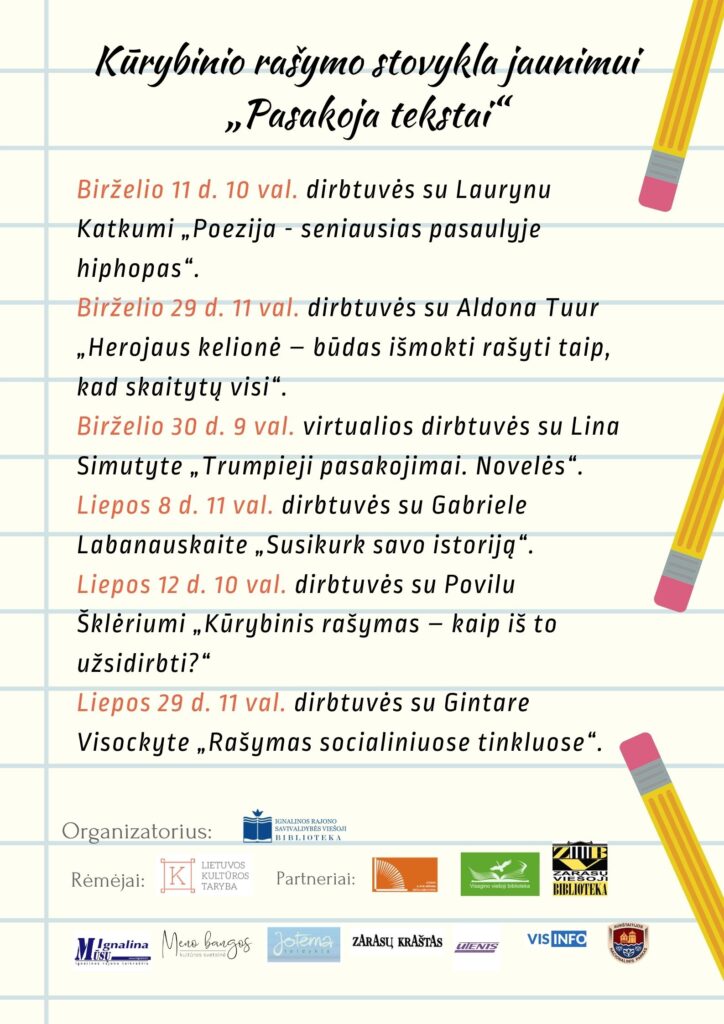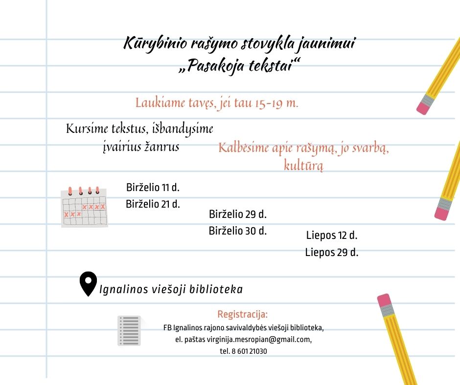 Ignalinos rajono savivaldybės viešoji biblioteka kviečia 15–19 metų kūrėjus dalyvauti kūrybinio rašymo stovykloje „Pasakoja tekstai“. Stovykloje išmoksite kritiškai vertinti literatūros procesus, lavinsite kūrybinio rašymo ir kūrybiškumo įgūdžius, rasite mokymosi ir kūrybinio eksperimentavimo erdvę. Taip pat stovykla suteiks galimybę atsiskleisti įvairiems gebėjimams, kurie ugdomi dalyvaujant kūrybinio rašymo dirbtuvėse.