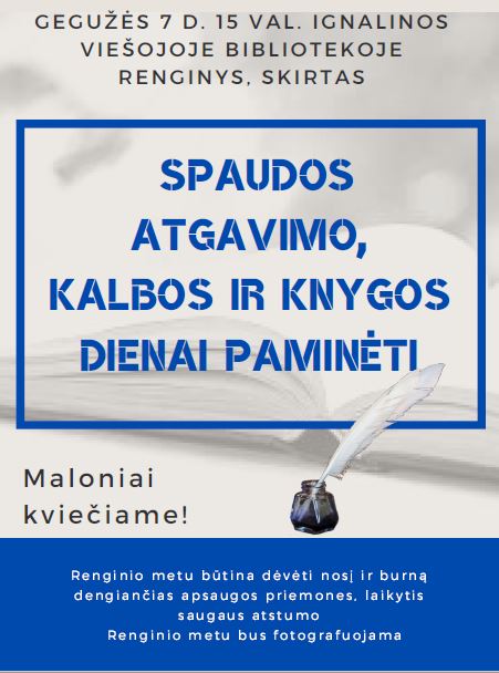 Gegužės 7 d. 15 val. renginys, skirtas Spaudos atgavimo, kalbos ir knygos dienai paminėti.