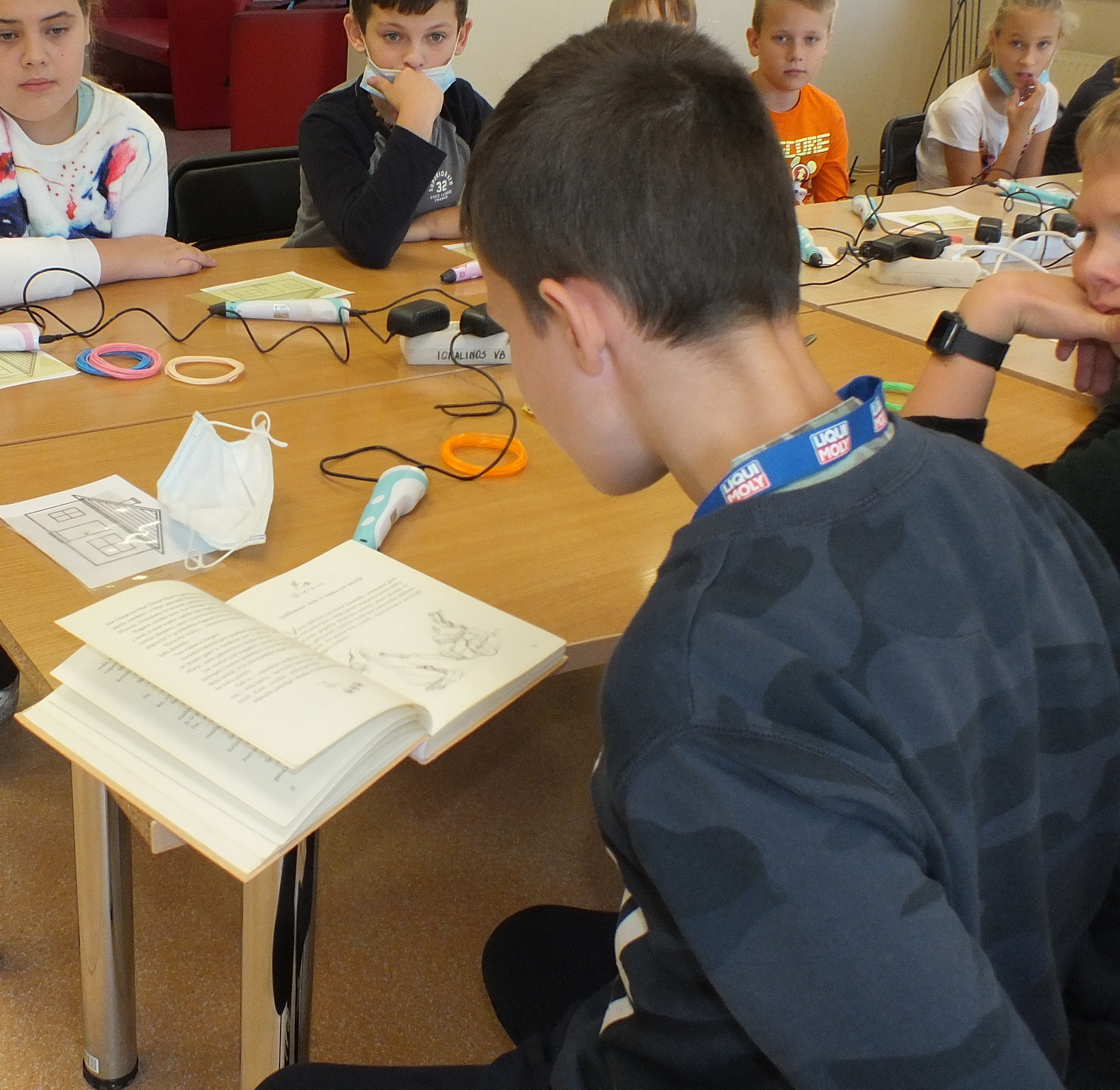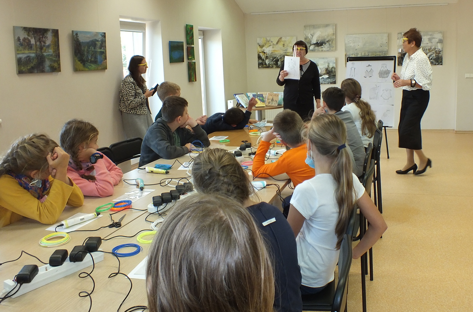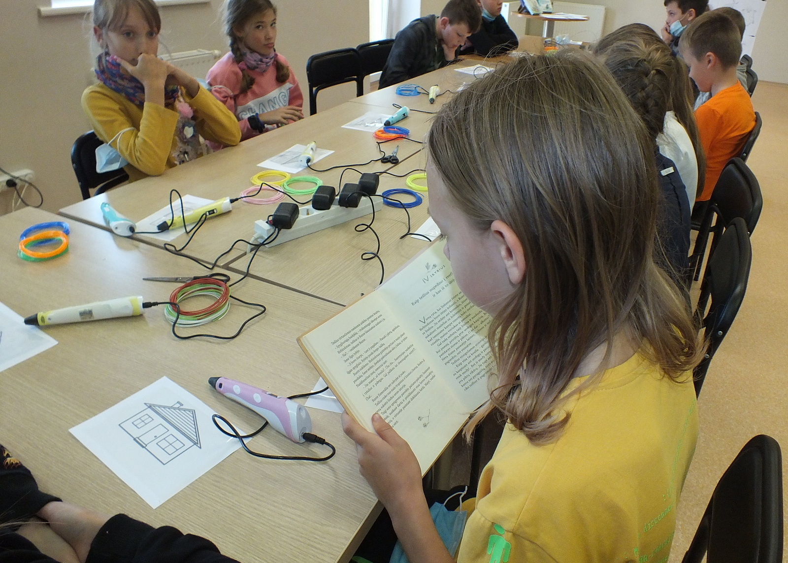 Šios knygos  trečią skyrių „Didžiaausė senė ir liūdna jos istorija“ garsiai skaitė  patys vaikai, o vėliau su 3D pieštukais  piešė trobelę, kurioje jaukiai gyvena knygos herojai. Darbelius atlikti vaikams sekėsi puikiai, taigi spalvotais nameliais nešini jie grįžo į mokyklą.