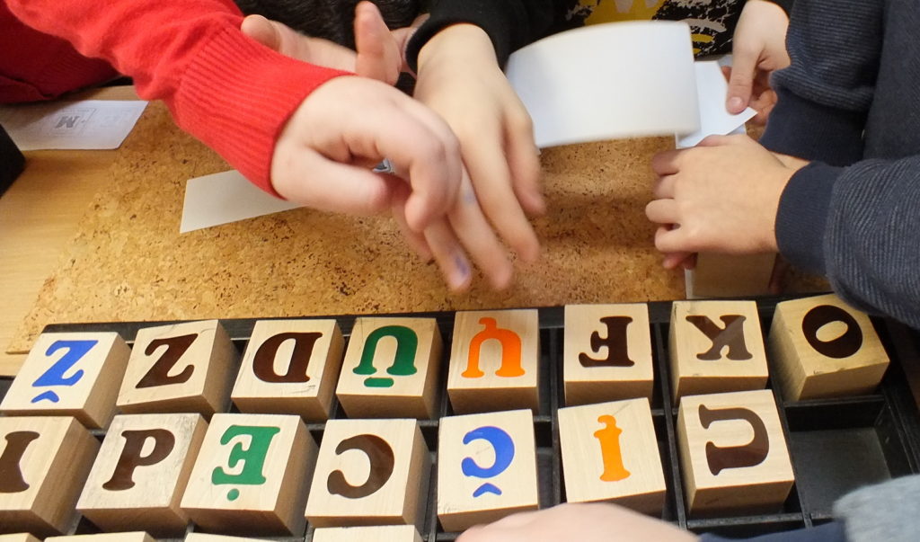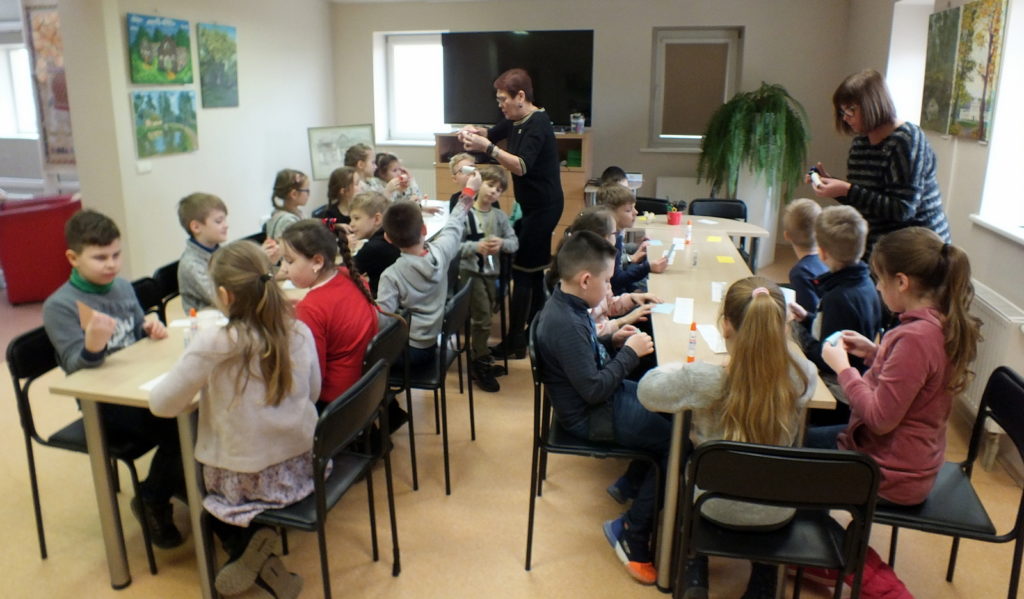 Dar jaunieji bibliotekos lankytojai  susipažino su bibliotekoje eksponuojama edukacine paroda „Paliesk lietuvių kalbą rankomis“. Įdomiausia Vaikams buvo spaudais su lietuviškomis raidėmis sudėlioti savo vardus.