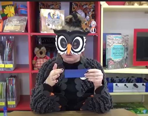 Pelėda Paulė rodo kaip greitai ir lengvai pasidaryti knygos skirtuką bei skaito ištrauką iš Tilde Michels knygos „Meškinas Gustavas pasakoja…“.