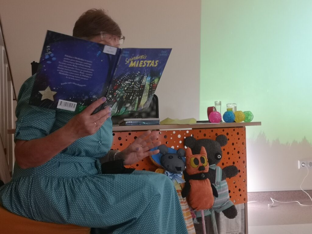 Bibliotekininkė Aldona vaikams pristatė ir perskaitė Teresos Heapy knygą „Spindintis miestas“. Šioje spalvingoje knygelėje pasakojama apie Peliuką ir Meškiuką ,kurie iš tamsios girios iškeliauja į spalvingą žiburių kupiną Spindintį miestą. Ten jiedu sutinka Katę . Ji pasisiūlo jiems aprodyti miestą.