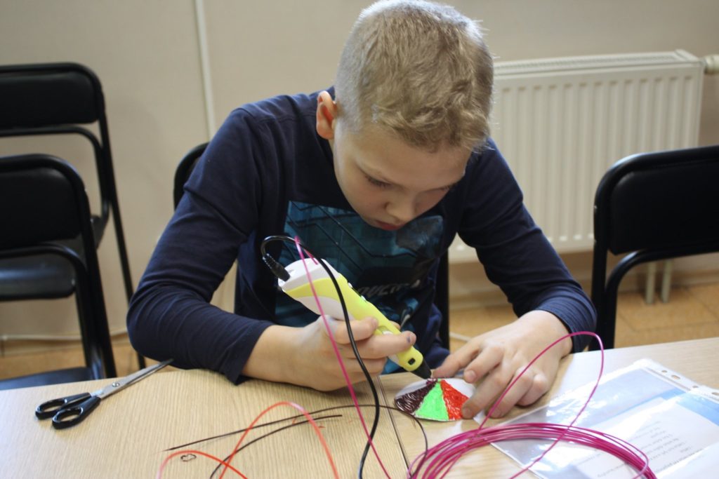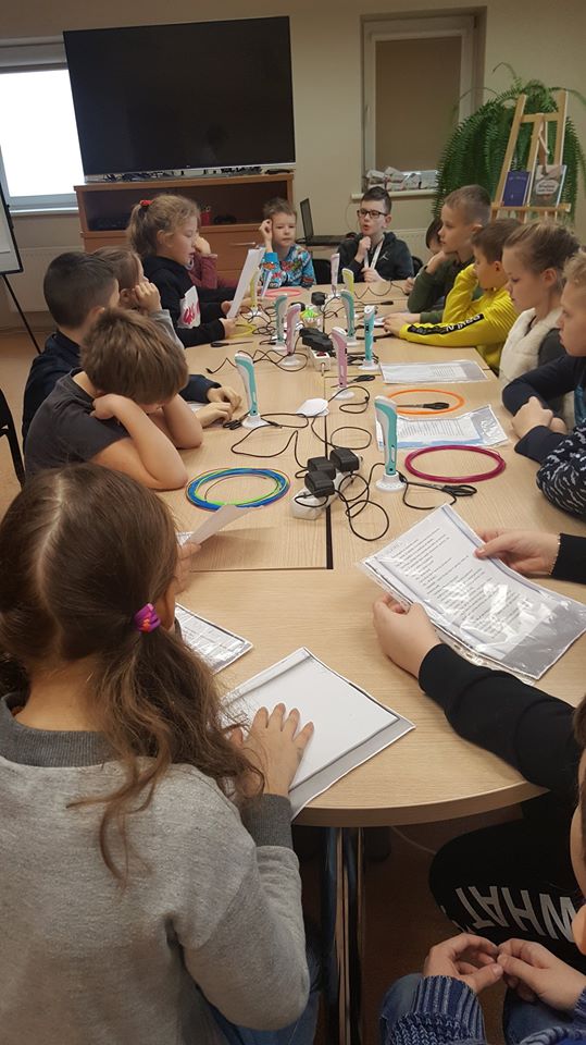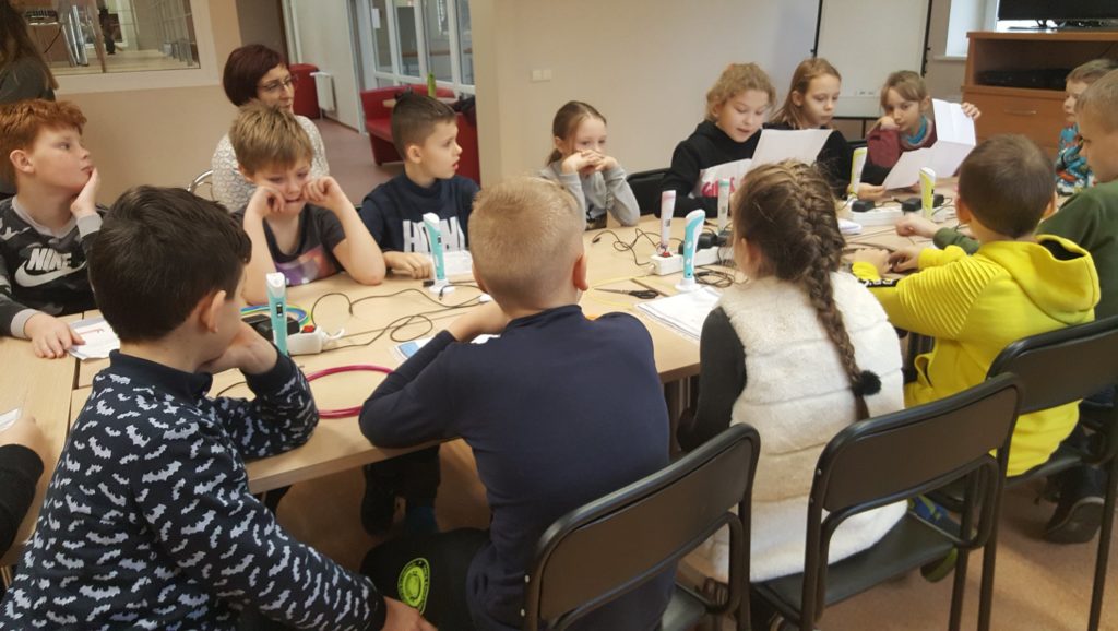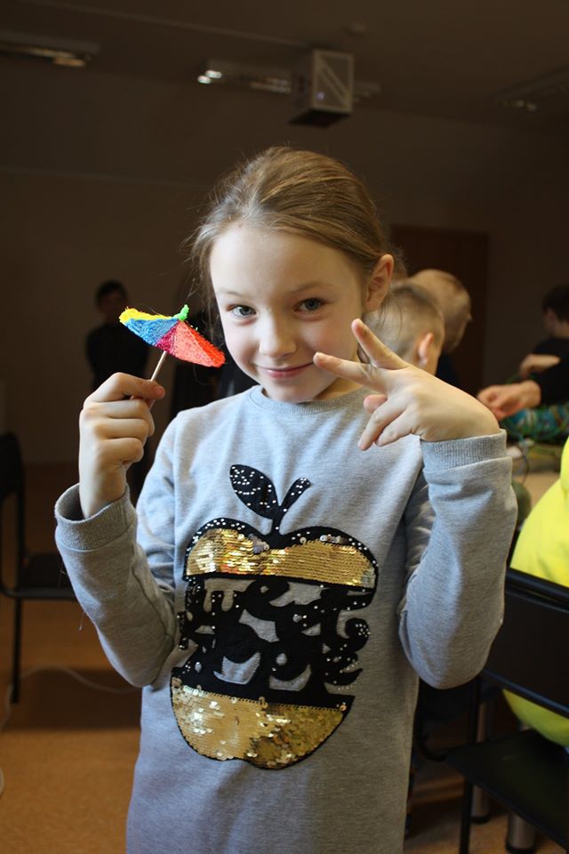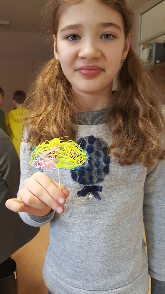 Susipažinus su knyga ir jos veikėjais mokinukai noriai dalyvavo edukacijoje „Pasigamink spalvotą skėtį“. Taigi, pasitelkus 3D pieštukus, visiems pavyko nupiešti puikius, spalvotus, trimačius skėčius, kurie padės pasislėpti nuo lietaus.